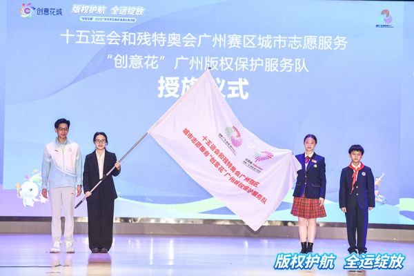 大中小学一体化织密版权志愿服务网为发动社会各界参与到保护十五运会版权的行列之中,在广州市版权局指导下,广州市版权保护中心发起成立十五运会和残特奥会广州赛区城市志愿服务“创意花”广州版权保护服务队,吸纳广州大中小学生及社会各界共同参与全运版权保护志愿服务。来自广东财经大学、广州实验中学、海珠区逸景第一小学的3位志愿者代表现场宣读《守护十五运会版权倡议书》,并接过队旗。